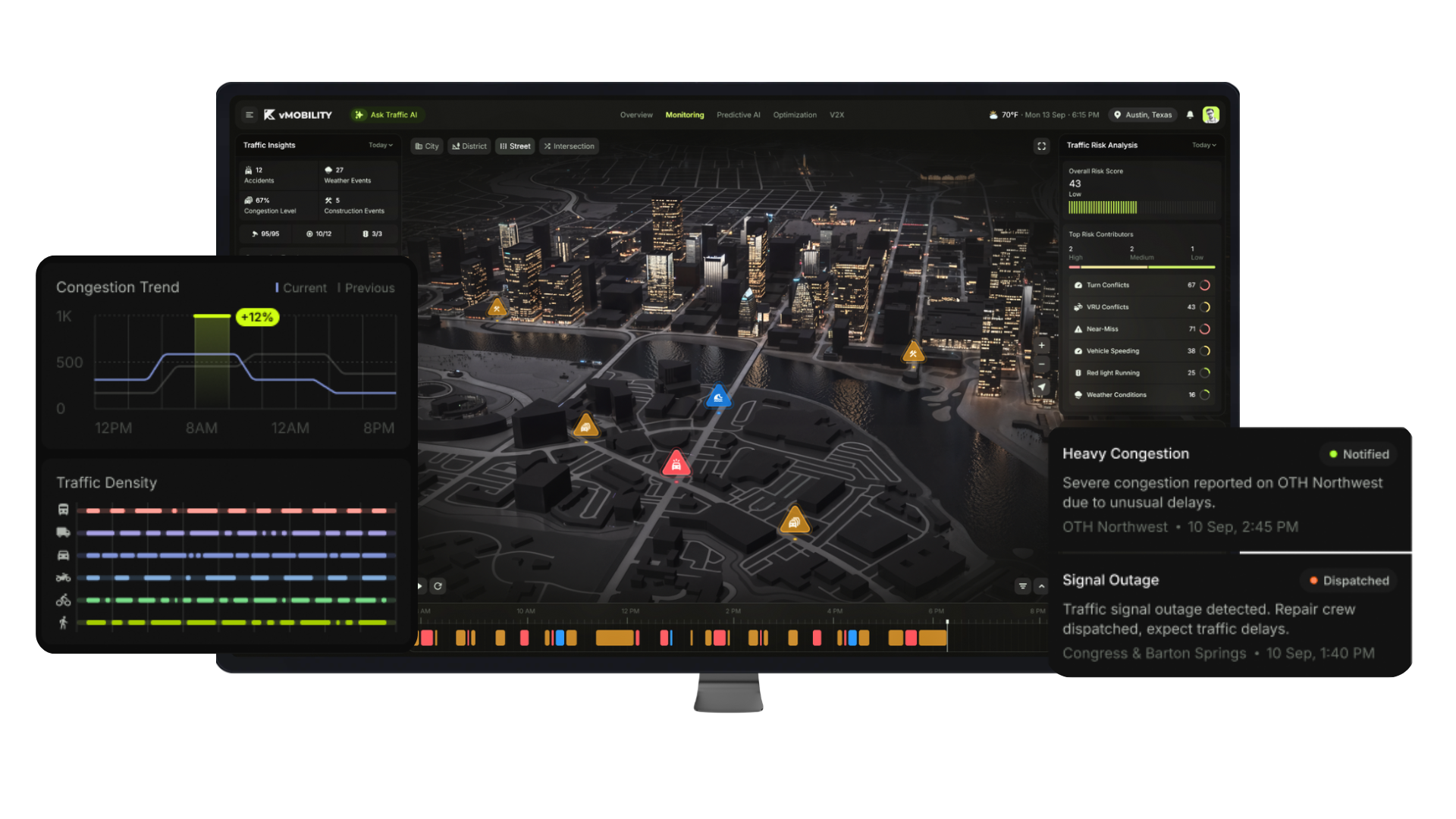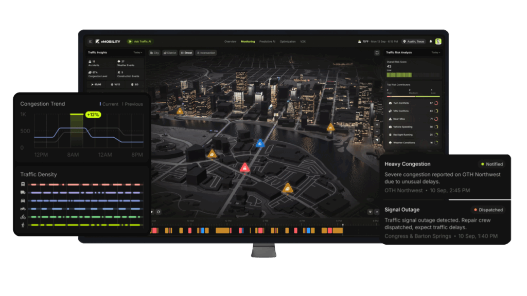 Computer vision analytics, conflict detection, adaptive traffic signal control, predictive simulation, cross-agency coordination, accidents and weather event response.